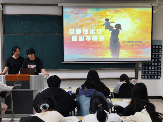 “同學們,猜一猜明天是什么節日啊?”“母親節!”5月11日,新聞傳播學類專業2023(7)、(8)班在K202教室開展以“愛要說出口,感恩不等待”為主題的團建活動?;顒娱_始前,活動負責人、新聞傳播學類專業2023(7)、(8)班的班長楊雨霏、朱研溪提前為每位同學準備好信紙和信封。朱研溪說:“我們希望通過寫信這種傳統而深情的溝通方式,讓同學們勇敢表達自己的心聲,將對母親的愛訴說于筆尖?!睂W生們觀看一段關于母愛的感人短片后,...